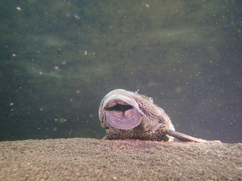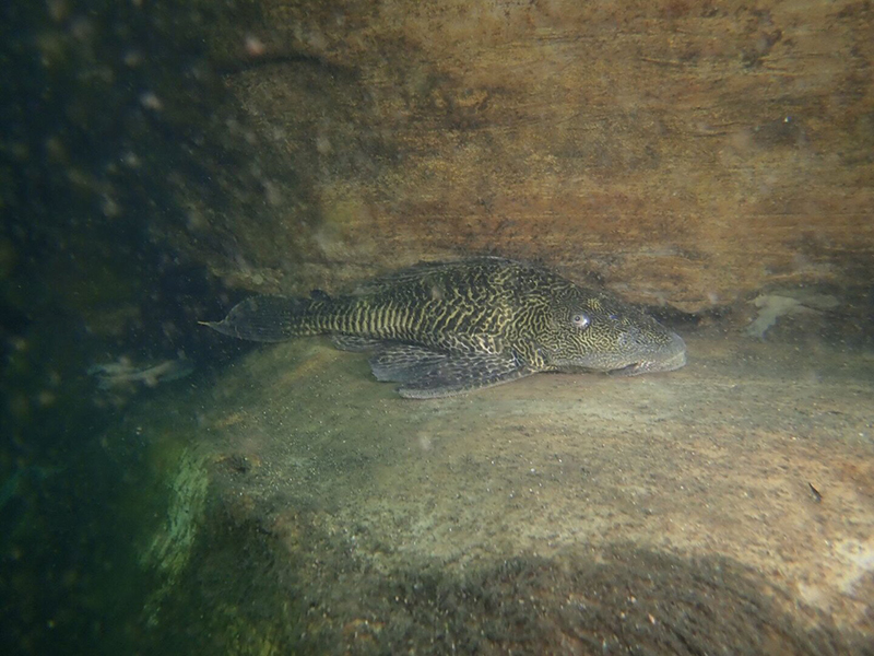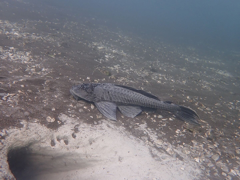A közel 60 cm testhosszúságú, a trópusi akváriumokból ismert „algaevő harcsára” emlékeztető hal egy agyagba vájt üreg előtt lebegett. A hal a búvárok közeledtére sem hagyta ott az üreget, így lehetőséget adott fotók készítésére.