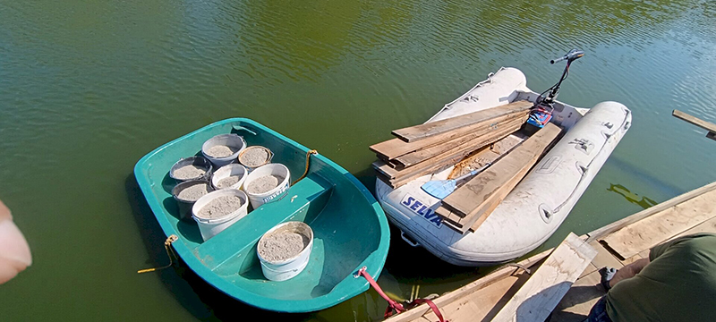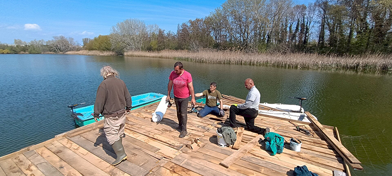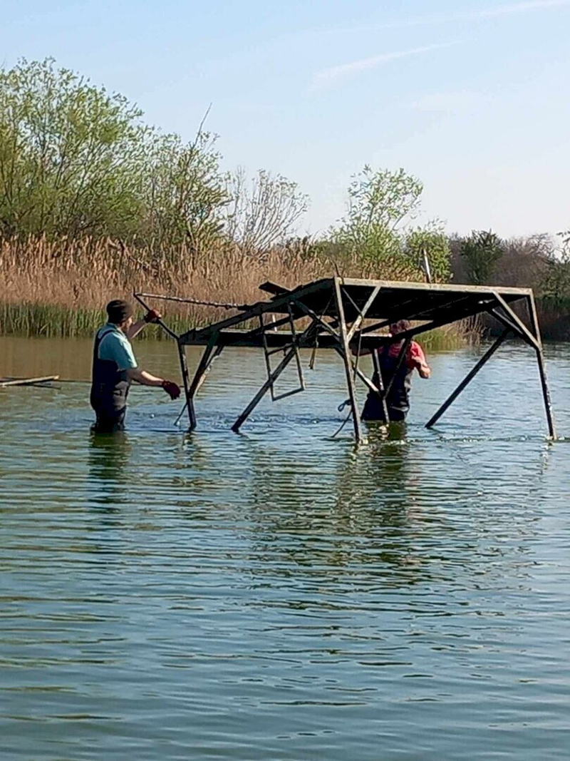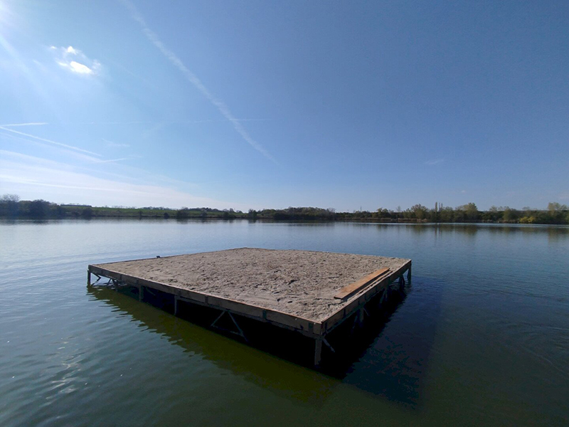Fontos információ a területtel kapcsolatban, hogy a Töreki-halastavakon a horgászat, a fürdőzés és a vízisport-tevékenység szigorúan tilos! Az egykor horgásztóként funkcionáló 10-es tavon ott maradt, mára már funkciójukat vesztett, olykor illegálisan használatba vett horgászstégeket munkatársaink tavaly októberben civil segítséggel a tóból eltávolították. A 10 különböző méretű stég remek lehetőséget kínált arra, hogy azokat megmunkálva, átalakítva egy közel 33 négyzetméteres szigetként kerüljenek vissza tavasszal a vízbe. Az újrahasznosítás révén minimális költségből megvalósítható volt a költősziget. A tél folyamán a stégek átalakítását sikerült terv szerint véghezvinni és a sziget vasszerkezete március végére elnyerte végleges formáját. Az elemeket megerősítették és azonos magasságúvá alakították a tó vízszintjéhez igazítva.