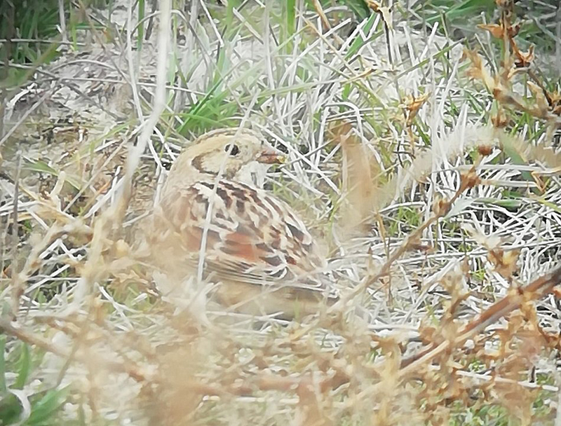 A veréb méretű madár a tómedertől délre eső barackosi vizes élőhely-rekonstrukció szélén, egy földút mellett szedegette a gyommagvakat. Ahogy közeledtünk felé, felröppent, de kissé távolabb ismét leszállt. Megfigyeltük, hogy a magányosan mozgó sarkantyús sármányok általában nem félnek az embertől, egészen közel lehet hozzájuk menni. Ha azonban csapatban vannak, akkor sokkal hamarább felröppennek.